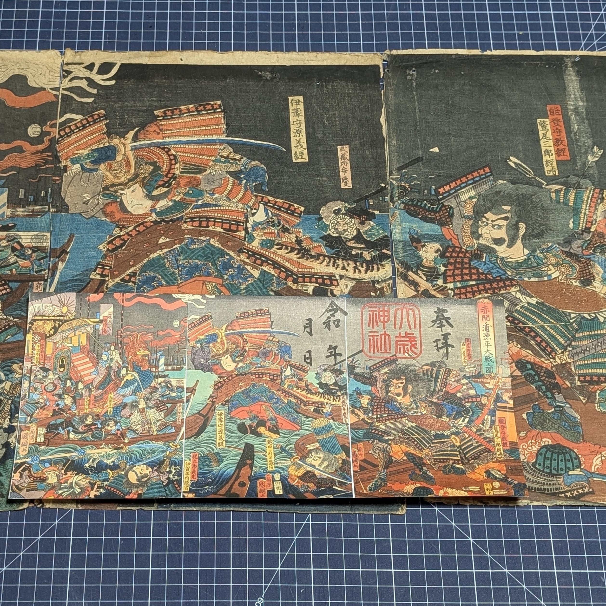 ※浮世絵が隠れても字入り(写真2枚目参照)(金字にて 遥拝 義経 八艘飛び 日付)がご希望の方は 備考欄に 字入り希望 とお申し付けください。