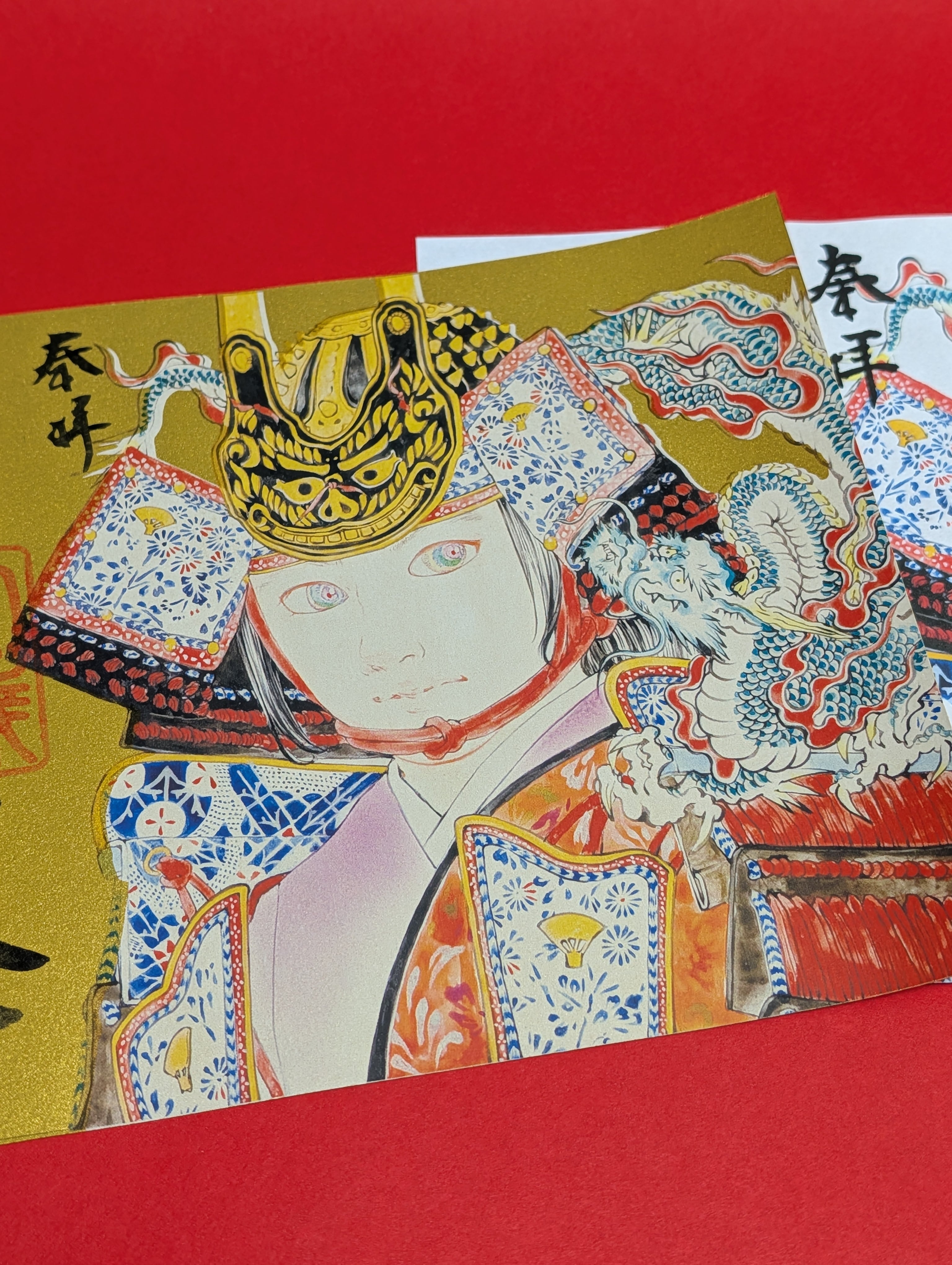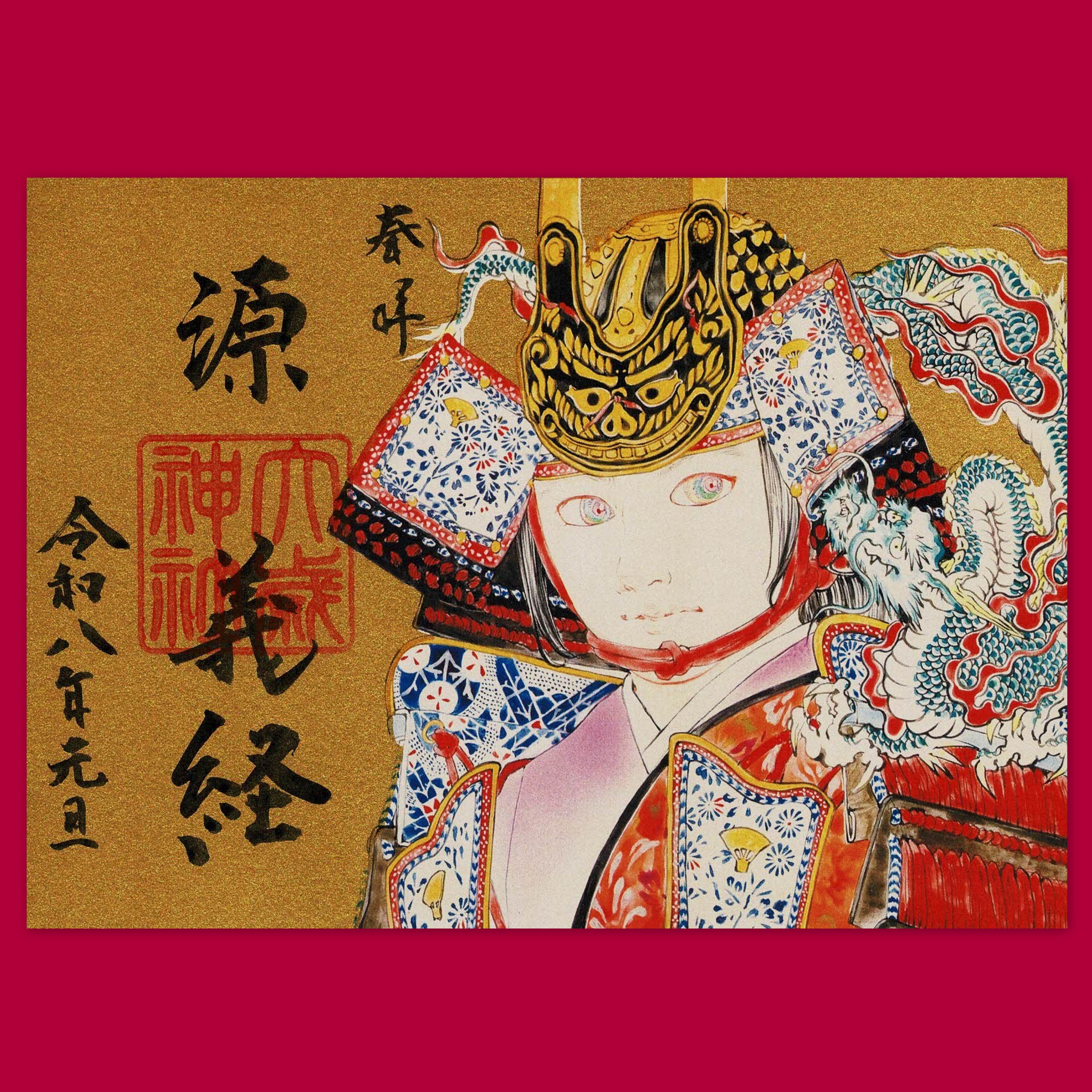 特殊加工: イラストレーターによる切り抜き加工を施し、義経公が背景から浮き出るような立体感を演出。