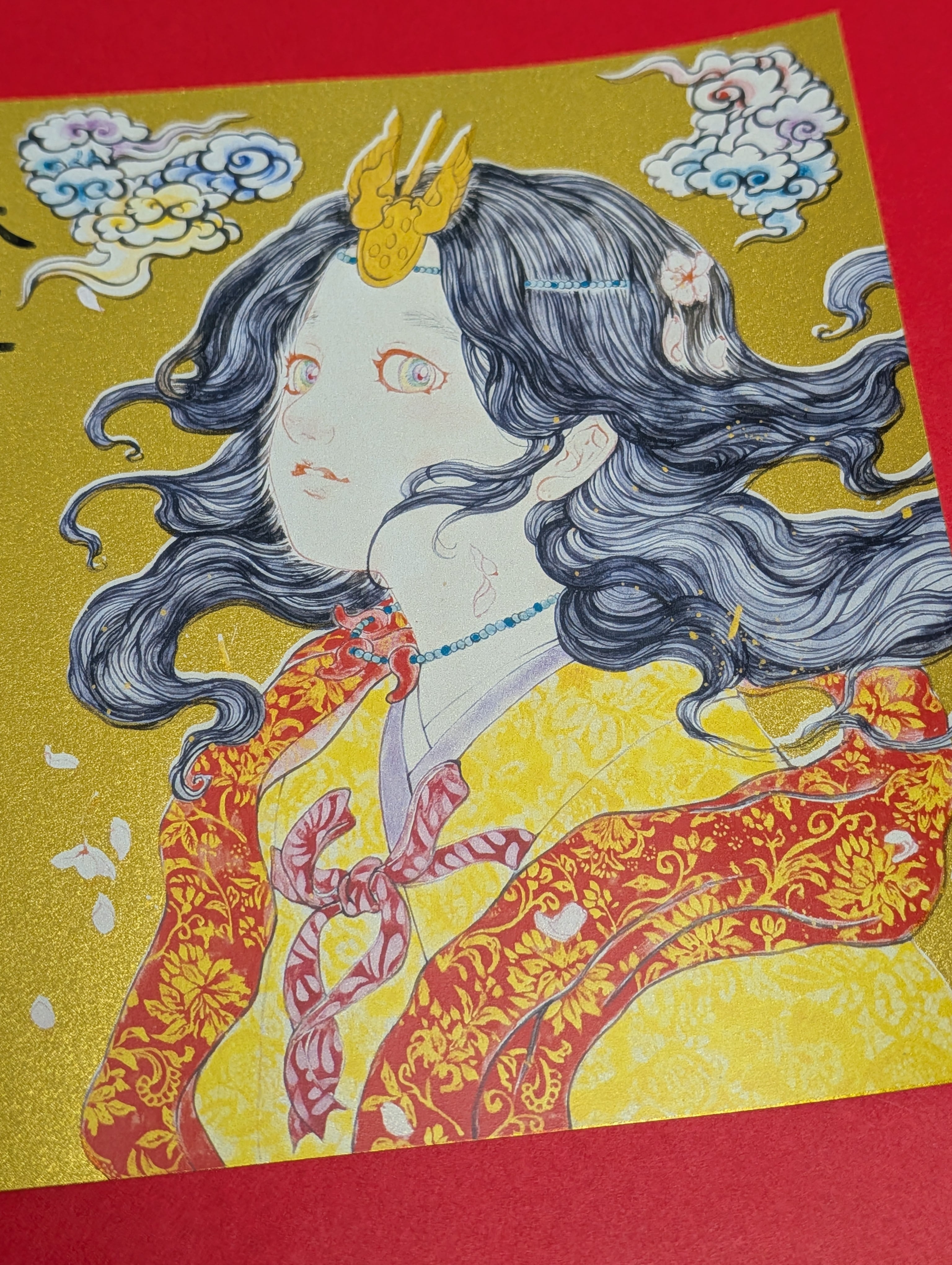 特殊加工: 義経公の御朱印と同様、イラストレーターによる背景切り抜き加工を施し、女神が浮き立つような立体感を演出。