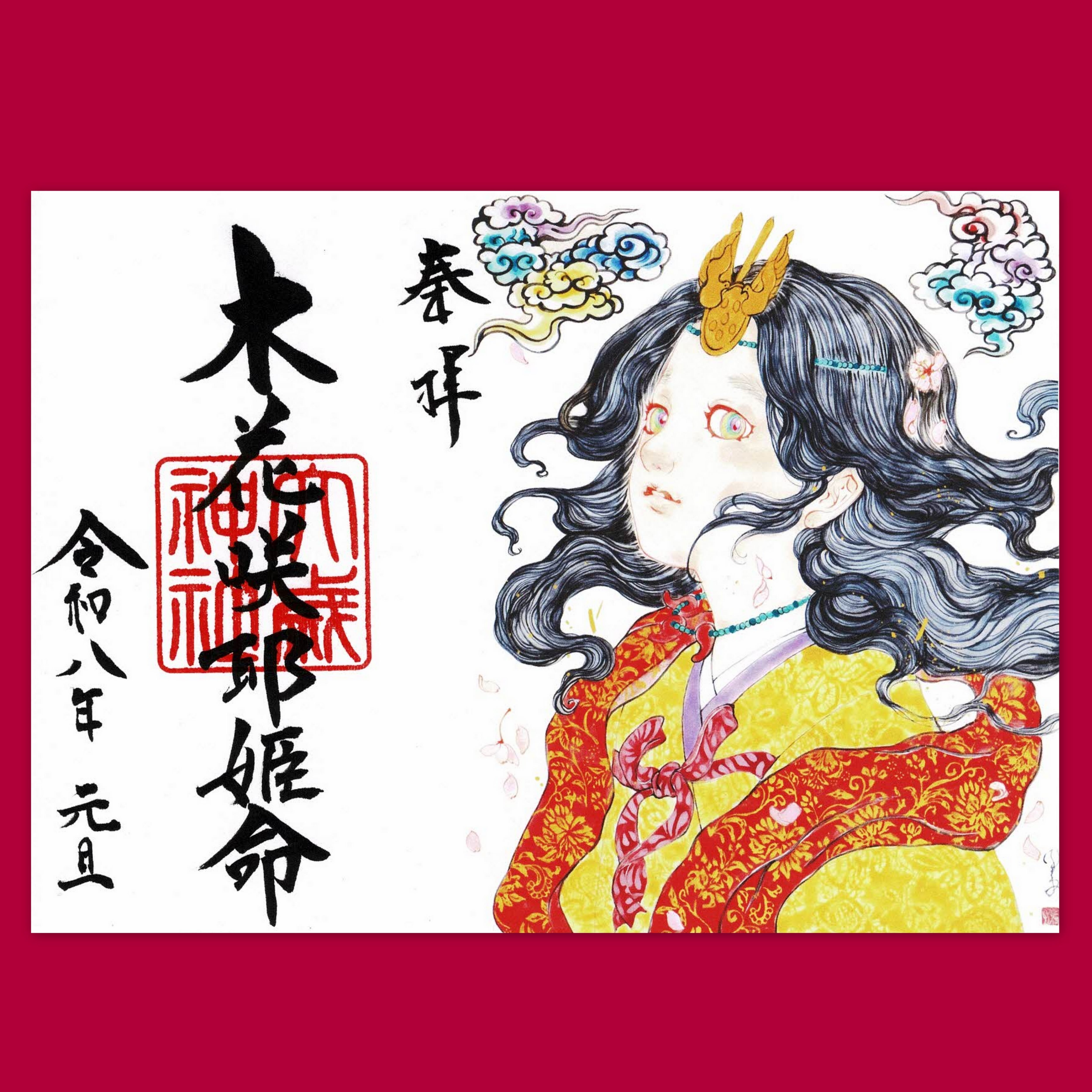 日本神話において最も美しいとされる女神、木花咲耶姫命(このはなさくやひめのみこと)。 その麗しくも芯の強いお姿を、日本画家・中園ゆう子氏(に描き下ろしていただきました。